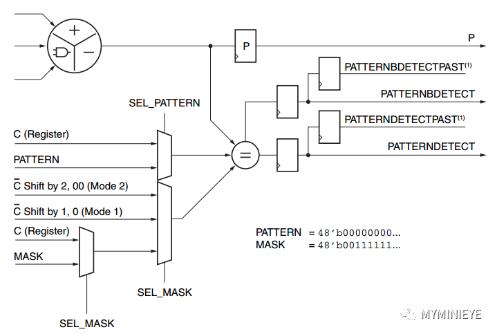 ⑨模式检测输出,模式检测用于检测P总线是否与指定的模式或者模式的 补码完全匹配,如果加法器的输出与设置的模式匹配,则PATTERNDETECT (PD)将变高,如果与设置的补码匹配,则PATTERNBDETECT(PBD)将变高,其 使用逻辑如下