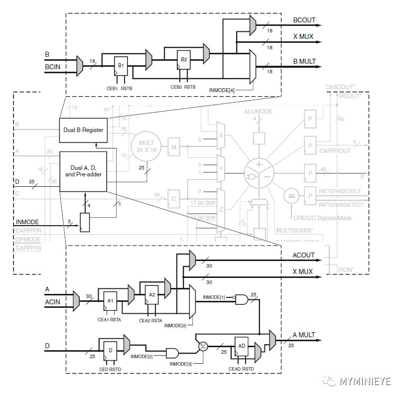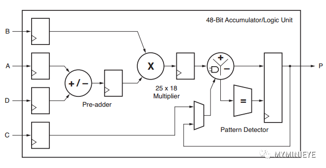 每个DSP48E1都有一个双输入乘法器,接着是3个数据通路的多路复用器和一个三输入的(加法器/减法器/累加器)