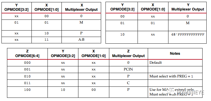 ③在最后的运算中我们选择加法运算。ALUMODE设置为4’b0000。即P=Z+X+Y+CIN其中Z=P,X=M,Y=0,CIN=0,M=A*B。所以P=P+A*B。