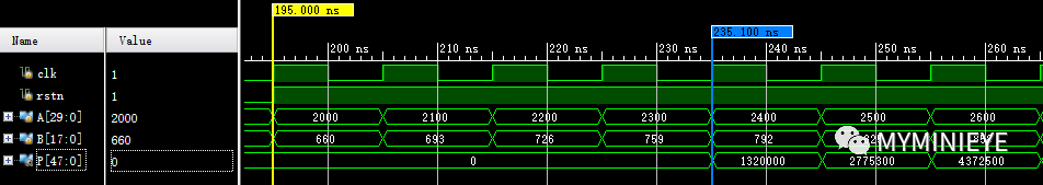 需要注意的是:在计算乘法时,M寄存器必须是打开的,多路复用器Z的输入通过P寄存器,因此输出至少滞后2个时钟周期,这里通过A2和B2寄存器输入,故延迟了4个时钟周期输出结果。