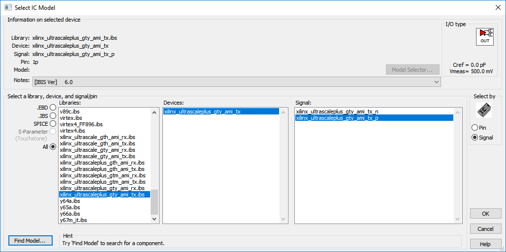 4. 在库窗口中选择 *_tx.ibs 文件并在信号窗口中选择 *_tx_p。Click OK