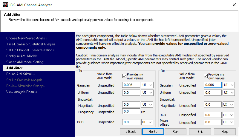 10.在添加抖动部分,将 Gaussian 设置为 IBIS-AMI 用户指南指定的值。点击下一步