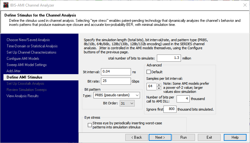 11. 在定义 AMI Stimulus 部分,根据用户指南示例设置用于仿真的总比特数(百万)、比特率和比特模式