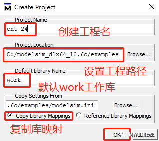 创建工程名、设置工程路径、确定默认工作库