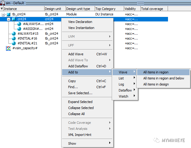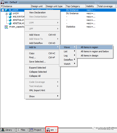 Sim:选择下图所示的sim,右键点击选中tb测试文件>addto>wave>all items in region