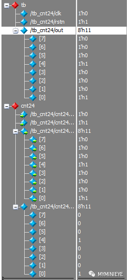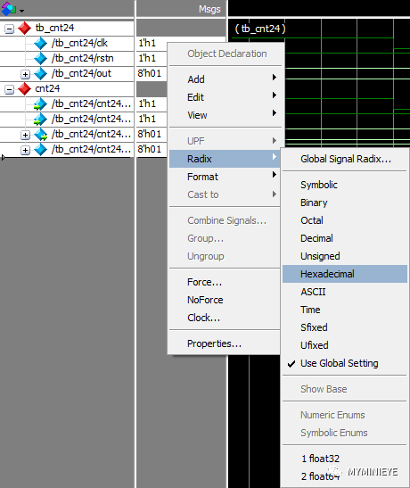 例:选择十六进制的信号格式:选中对应信号右键>Radix>hexadecimal