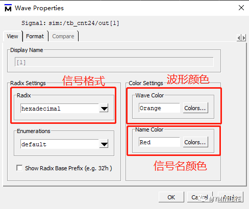 也可在属性Properties中修改信号格式,修改波形颜色,信号名颜色;