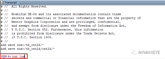 可在Transcript命令行输入run 1us命令,运行 1us 时间,也可运行其他时间
