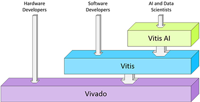 为了帮助设计人员使用这些器件来构建设计,Xilinx 提供了一套工具来满足硬件开发人员 (Vivado)、软件开发人员 (Vitis) 以及 AI 和数据科学家 (Vitis AI) 的需求。