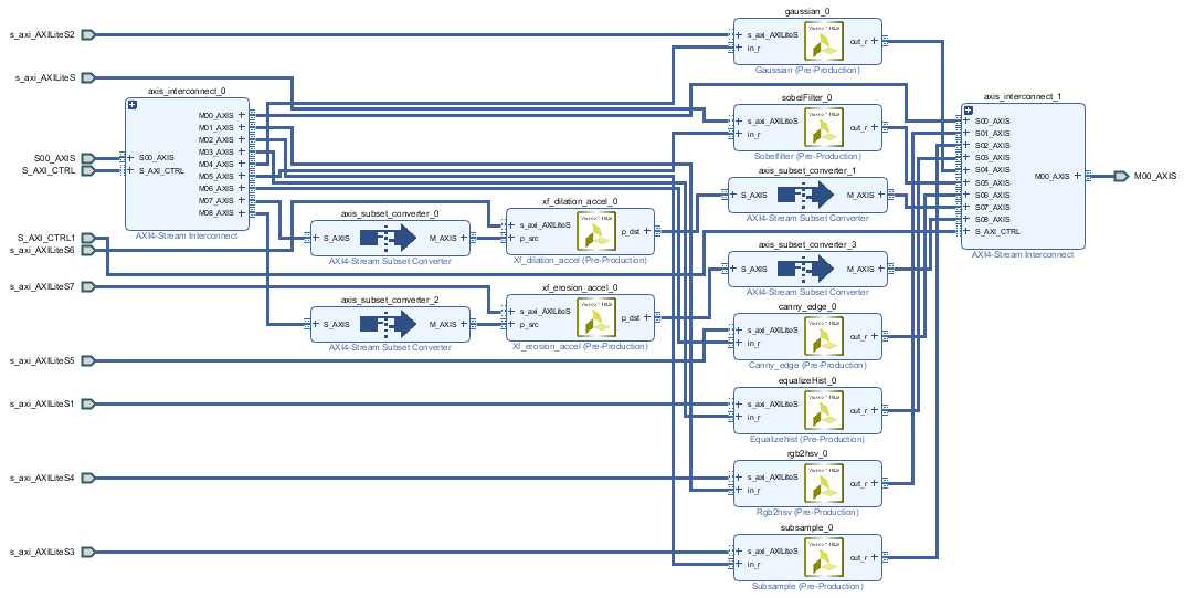 Overlay中实现了多个图像处理算法,在HLS中实现并封装为IP后在Block Design中被调用,读者如有兴趣可以在Github的/boards/src/ip/目录获取源代码。