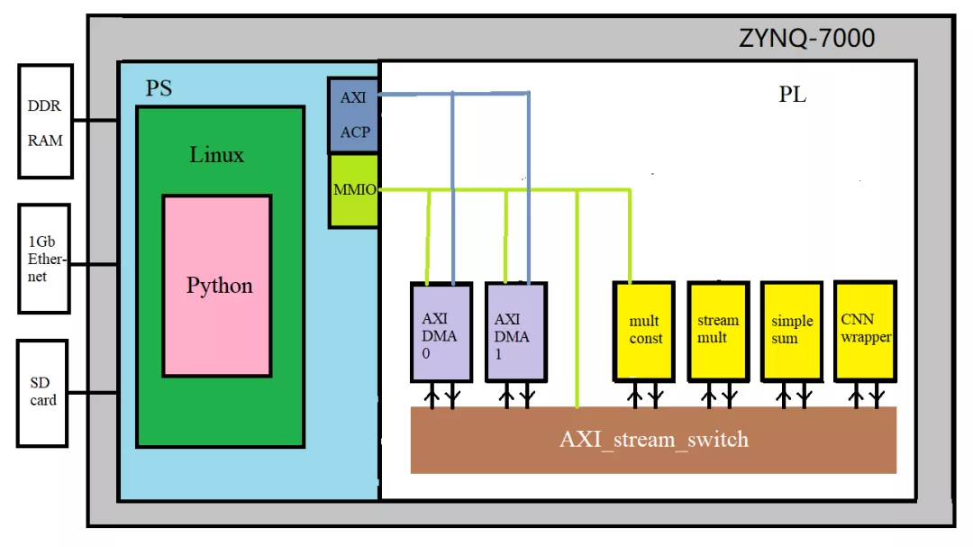 上图为工程项目示意图。通过软硬件划分,在PS端中负责Linux和通信,而PL端负责运算加速。在PYNQ中加载bit时,PL端的控制部分将以IP核形式呈现。通过Python,对IP核的参数配置来实现控制。