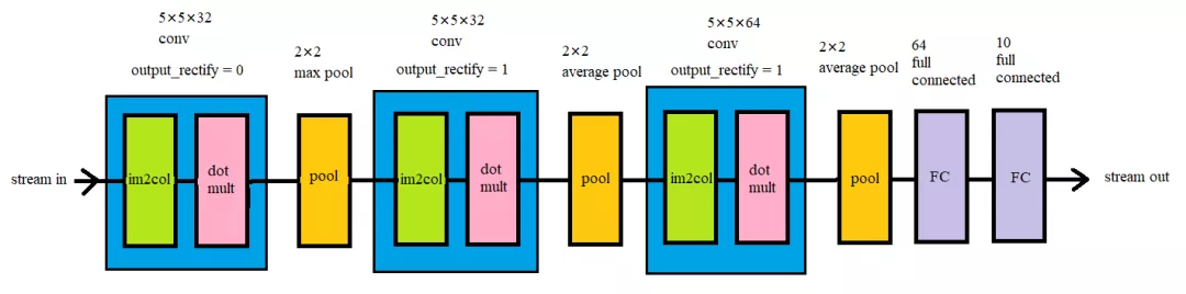 此项目中采用的CNN结构示意图(以CIFAR_10为例子),本项目中的卷积层由两个子层构成,一个是im2col子层,它的作用是将输入矩阵中的卷积窗口展开乘一维向量,另一个是点乘子层,它的作用是将im2col子层输出的向量和展开成一维的卷积核相乘加。卷积层有一个参数是output_rectify,这对应的是当前卷积层是否应用Relu非线性层,0为否,1为是。池化层(pool)有两种选项,一是最大值池化,二是平均值池化。