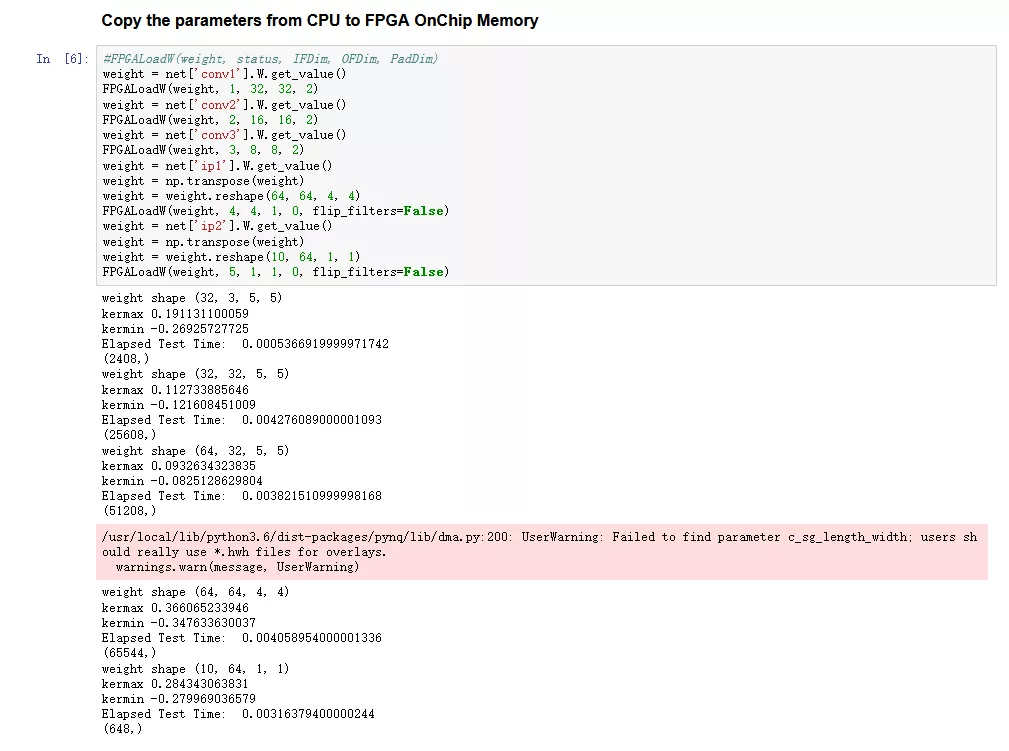 我们将模型参数导入硬件,使用FPGALoadW函数来实现这一步。函数会打印出一些有关信息。