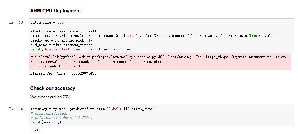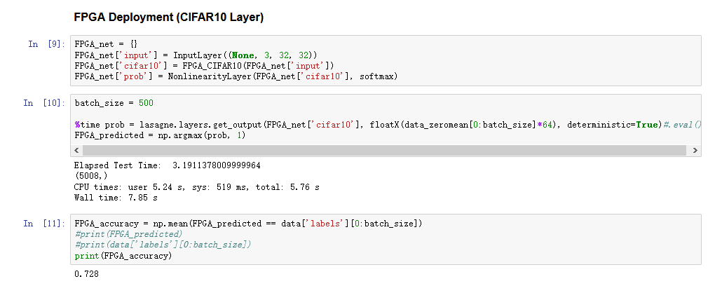 这里我们构建一张新的网络,把原来的中间层换成我们自定义的FPGA_CIFAR10层,这一层把原来的中间层全部包含了进去,并在FPGA上实现。然后输入数据集,得到结果,结果保存在FPGA_predicted中。最后显示了准确度,达到72.8%。这里也会显示一些耗时。