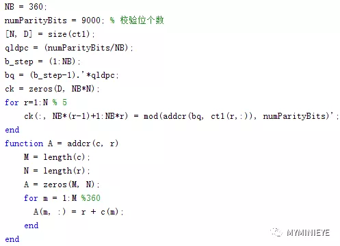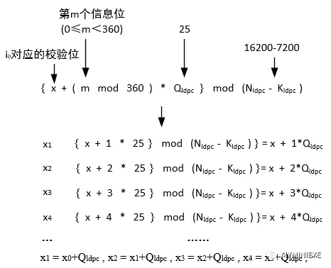 对于接下来的359个信息位,im,m=1,2,…,359。在{x+(m mod 360) * Qldpc } mod(Nldpc-Kldpc)指定的校验位地址累加信息位im,其中x表示信息为i0对应的校验位地址。