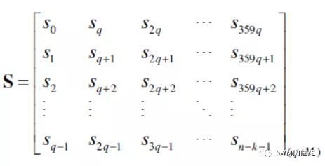 FGPA不可能一次性存储那么多的数据,并且也不现实,需要根据实时的计算产生校验位。通过上述的分析可知,LDPC码的编码具有周期为360的并行结构,如果把长度为K的信息比特分成r=K/360组,长度为N-K的校验比特分成s=(N-K)/360如下所示
