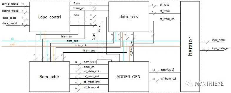 根据以上的公式推导,提出以下的实现结构,有三个主要部分组成:第一部分计算Sr的值,第二部分就算S矩阵中列的累加和,第三部分计算校验位。编码器的系统结构主要包括编码配置模块(Ldpc_contrl),信息位分组计数模块(data_recv),基地址产生模块(Bom_addr),数据地址计算模块(ADDER_GEN),校验位计算模块(iterator),整个系统结构如下图所示: