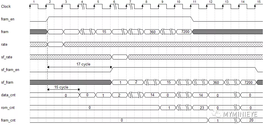 模块的主要作用是对输入的信息比特进行序号标记,采用三个计数器,其中data_cnt为 0~14 表示15个数据 rom_cnt 为 0~23,24组表示共24*15=360个数据,0表示初始数据,fram_cnt,360bit的组数统计。如对应1/2码率,输入数据为7200bit,则数据可分为:20*360 = 20*15*24 =7200,下图为信息位分组计数模块主要信号的时序图,延迟的是因为在计算校验位地址的时候会花费时间,为了后边计算校验位时信息位能够和校验地址对齐。