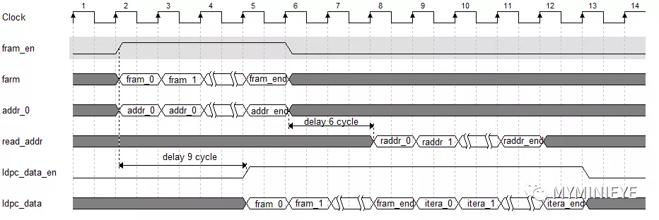 仿真时钟周期为20ns,地址输出相对信息位使能延迟了16个时钟周期,其中移位输出的计数器分别延时了两个时钟周期。延迟是为了在校验位计算的时候,地址能够和信息位对齐。