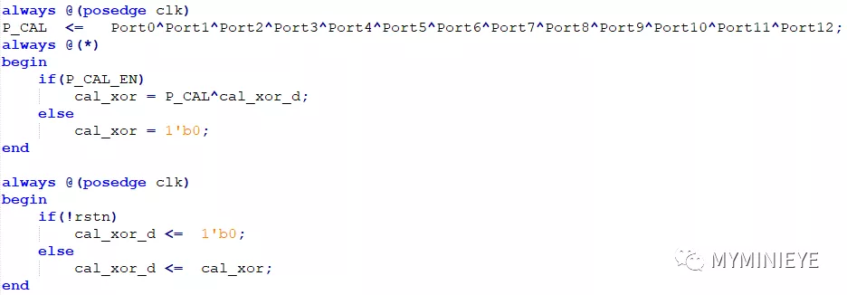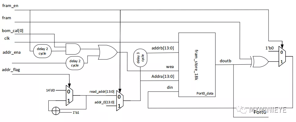 双口ram设置为read first,数据相对于地址有三个时钟的延迟。上述中所涉及的延迟均在调试中根据运算所需时钟数进行的延迟。采用13个并行度计算校验位,其中的一个的结构如下,addr_ena和addr_flag均由read_addr控制。