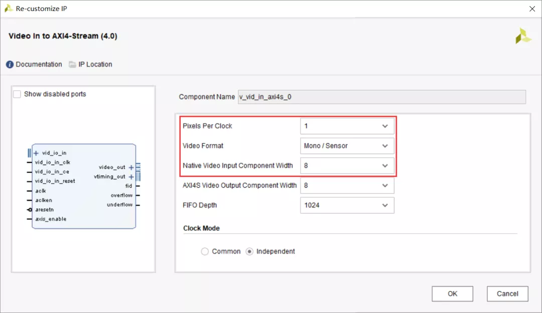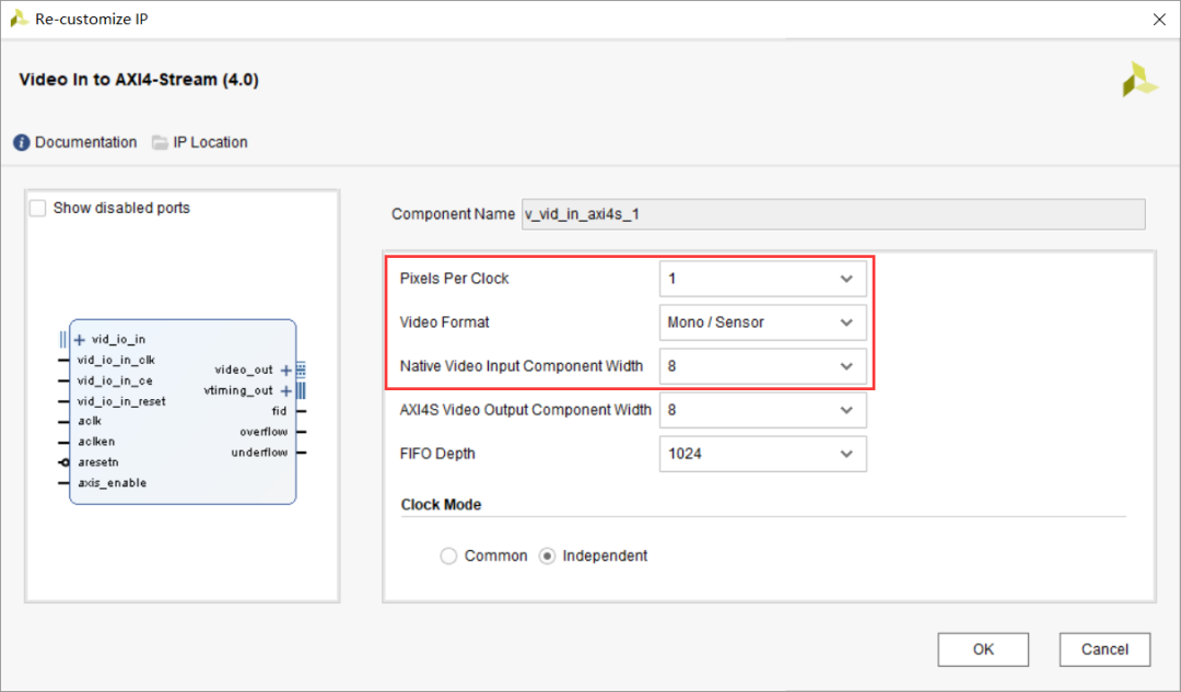 视频的采集使用的是Video In to AXI4-Stream IP核,例程中将其配置为Mono/Sensor,1 pixels per clk,每个色彩数据位宽为8bits。例程使用2个IP核分别采集2路摄像头图像,具体配置如下图所示: