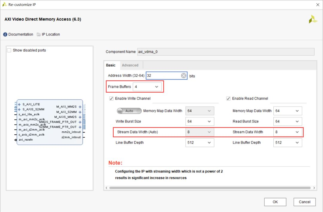 使用VDMA(AXI Video Direct Memory Access) IP核,S2MM将视频流传送到DDR中,MM2S再从DDR中把图像数据传输出去。例程2个VDMA IP核,每个IP核使用4个frambuffer,stream的数据宽度为8bits,如下图: