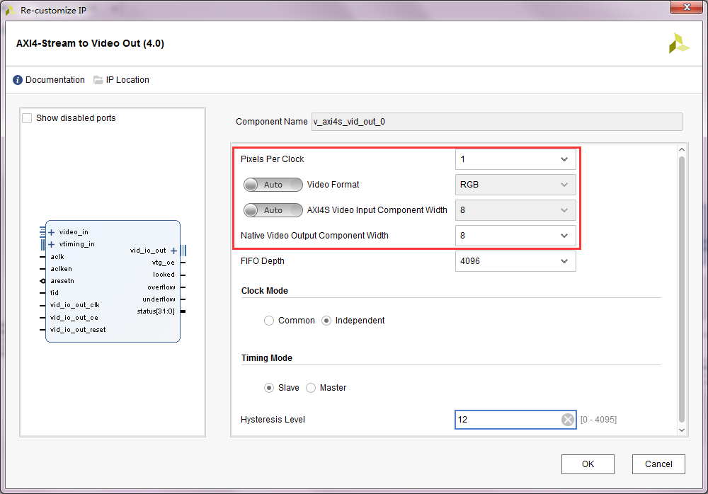 使用AXI-Stream to video out IP核显示视频,将其视频格式配置为RGB,1 pixels per clk,每个色彩数据位宽为8bits。IP核具体配置如下图: