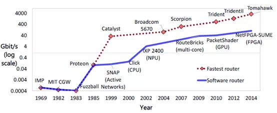 即使使用提供有效隔离的技术(例如SNAP),在通用处理器上执行数据包转发时,也会对性能造成重大影响。例如,SNAP在2001年报告的转发速率为100Mbit/s,比1998年开发的Juniper M40 40Gbit/s硬件路由器慢了两个数量级。