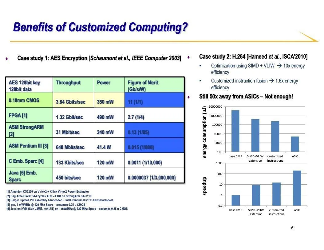 可定制计算和人们通常所知的通用处理器相比有着巨大优势。实际我在UCLA的同事Ingrid Verbauwhede教授的工作对我们的研究有不少启发。她2003年在加密编码算法的研究中得到了对于可定制计算非常有利的实验结果[6]。她使用加密算法的专用集成电路(ASIC)实现作为性能基数,如下图左边表格第一行所示。第二行是使用可定制计算的方法得到的运行数据,第三行是在ARM上编写汇编得出的运行数据。可以看见可定制计算总体优于此种方式85倍。再往下一行是在奔腾CPU上编写相同功能的汇编代码得到的运行数据,这在当时是最好的台式机芯片。可定制计算的优势高达8000倍。也许你会说这项研究是否有点老?那我们再来看一些其它的比较工作。下图右侧的图表来自一篇斯坦福大学2010年发表的文章。他们使用H.264视频编解码算法对定制指令集进行了评估。可以看见即使是用上了SIMD和定制指令集,通用CPU和ASIC的差距还是有50倍。显然你不可能对每个计算应用都开发专门的ASIC,这是一项既烧钱又耗时的工作。关键问题是任何算法的改动都需要重新开发一整块新的ASIC。请注意在左边的例子中,第二行的可定制计算是使用可重构的现场可编程逻辑门阵列(FPGA)做的实现。它既可以做到快速低成本,又保证高于通用CPU的性能。所以利用FPGA是一个非常有前景的解决方案。