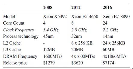 软件分组处理器是灵活的,但不是很快。软件分组处理器是用高级编程语言(例如C或C ++)编写并在通用CPU上执行的软件程序。25Gbps网络接口可以每19.2ns接收最小大小(64B)的数据包。但是,以这种速度,即使是对最后一级缓存的单次访问也将花费比数据包的到达时间更长的时间。即使使用所有高级软件技术(例如内核旁路,接收方缩放和数据直接I / O),在软件数据平面中处理数据包也具有挑战性。更糟糕的是,由于频率缩放停滞,CPU性能不可能提高。表1总结了2008、2012和2016年用于构建软件数据平面的CPU的三个示例,它们比较了CPU频率,内核总数,制造过程和内存带宽。表格的“核心数量”行显示,2016年CPU核心总数从4个增加到24个,而时钟频率从3.4GHz减少到2.2GHz。如果我们使用时钟频率来估计单线程性能,则性能在2008年至2016年期间不会得到改善。由于网络链接速度接近25Gbps或100Gbps,软件网络数据平面对服务器计算和内存功能造成了很大压力,因此变得不切实际。