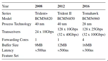 基于ASIC的分组处理器速度很快,但不灵活。 这些分组处理器通常用于现代交换机和路由器中,并且倾向于处理一组有限的协议。例如,表2比较了从2008年到2016年的三代Broadcom交换机ASIC,它们是交换机开发中使用的主要设备。收发器行显示,在此期间,端口数量和每端口链接速度已显着提高。但是,开关ASIC提供的功能集在很大程度上保持不变。因此,尽管性能有所提高,但在提供可编程数据平面方面,ASIC仍然不是最佳选择,因为难以满足未直接支持的应用要求。