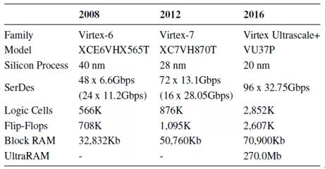 用FPGA实现的分组处理器在硬件性能和软件灵活性之间取得了平衡。例如,NetFPGA项目已被用于原型最短路径路由和拥塞控制算法。使用诸如Verilog之类的硬件描述语言来表达设计,并使用供应商特定的布局布线工具将其综合到FPGA。表3展示了Xilinx在2008、2012和2016年中的三代Virtex系列FPGA。我们为每一代选择了顶级的FPGA模型。Xilinx在每一代产品中使用的工艺技术与Broadcom在同一时期所采用的制造工艺相似。在此期间,Virtex FPGA上收发器的数据速率增加了3倍(从Virtex-6中的11.2Gbps增长到Virtex UltraScale +中的32.75Gbps),收发器的总数从Virtex-6中的72个略微增加到96个在UltraScale +中,由于封装限制,缩放比例有限。FPGA上的逻辑和内存资源分别增加了2倍和5倍。总体而言,FPGA由于具有可重新配置性,因此可以为软件提供竞争性的灵活性。它们提供了与ASIC相当的性能。