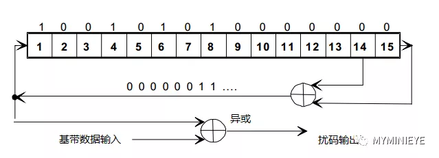 对数字信号的比特进行随机处理,减少连0和连1的出现,从而减少码间干扰和抖动,方便接收端的时钟提取;同时又扩展了基带信号频谱,起到加密的效果。为了保证在任何情况下进入传输信道的数据码流中“0”与“1”的概率都能基本相等,传输系统会用一个伪随机序列对输入的传送码流进行扰乱处理,将二进制数字信息做“随机化”处理。