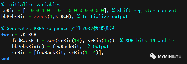 根据以上结构,在matlab里产生伪随机序列,函数代码如下,其中K_BCH 为7032,为一组数据的长度,运行得到7032长度的伪随机序列码。