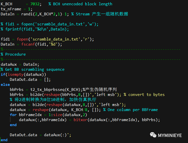 产生一组随机数据,用作数据的输入,与此同时,这个数据也被用作modelsim的数据输入。输入数据和m序列作模二加,即异或,进行扰码处理,得到最终输出,扰码的matlab的程序如下