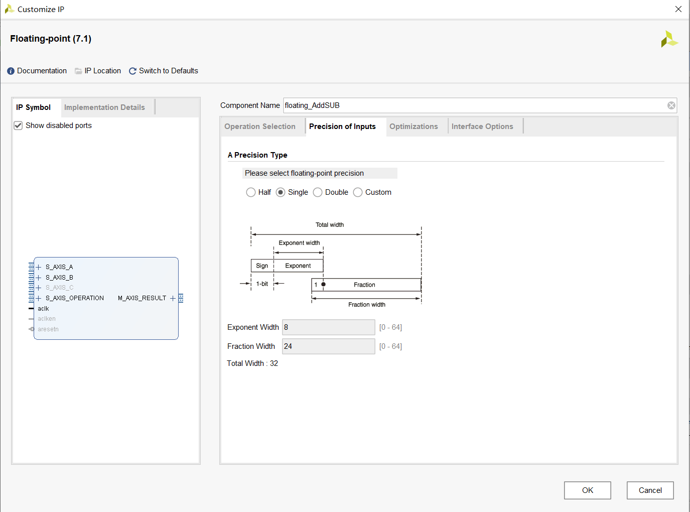 2 > Precision of Inputs 我们选择单晶浮点数(Single),指数位宽Exponent Width 8bit 尾数位宽24 bit