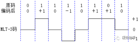 MLT-3即Multi-Level Transmit-3,多电平传输码,MLT-3码跟NRZI码有点类似,其特点都是逢“1”跳变,逢“0”保持不变,并且编码后不改变信号速率。与NRZI码不同的是,MLT-3是双极性码,有‘-1’、‘0’、‘1’三种电平,编码后直流成份大大减少,可以进行电路传输,100Base-TX采用此码型。