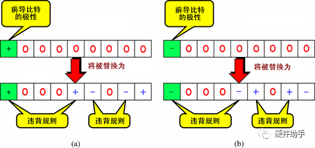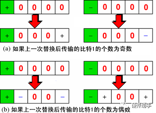 编码规则:根据前导比特1的极性和自上一次替换后传输的比特1的数目,按四种方式相应改变编码。