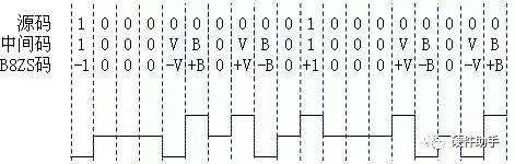 B8ZS即Bipolar with 8-zero substitution,双极性8零替换编码,北美的编码方式。基于双极性AMI,如果出现连续八个0,且其前导比特1是正电平,则八个0比特被编码为:0 0 0 + - 0 - +,如果出现连续八个0,且其前导比特1是负电平,则八个0比特被编码为:0 0 0 - + 0 + -,其中有两个码元违背了AMI编码规则(所谓“扰乱”),亦不可能是由噪声产生。接收方检测到这一组编码后,会将其还原为连续八个0的比特序列。