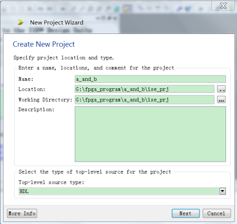 弹出如图 2 所示的界面,在 Name 处填写工程名字(尽量保证与顶层文件名一致即a_and_b), Location 处选择工程存放的路径, Working Direction 默认路径与 Location一致, Top-level source type 处按照所需选择,此处我们选择 HDL。