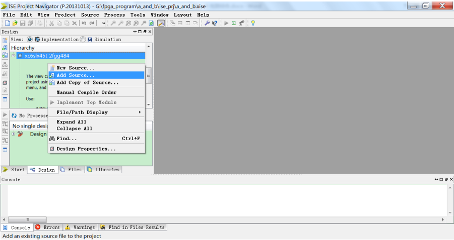 点击 Next,再点击 Finish 完成工程的创建。按照图4所示,右键点击芯片型号,选择 Add Source…添加已经存在的文件(a_and_b.v)。找到 design 文件夹中a_and_b.v 文件所在的路径,选中该文件,点击 OK。