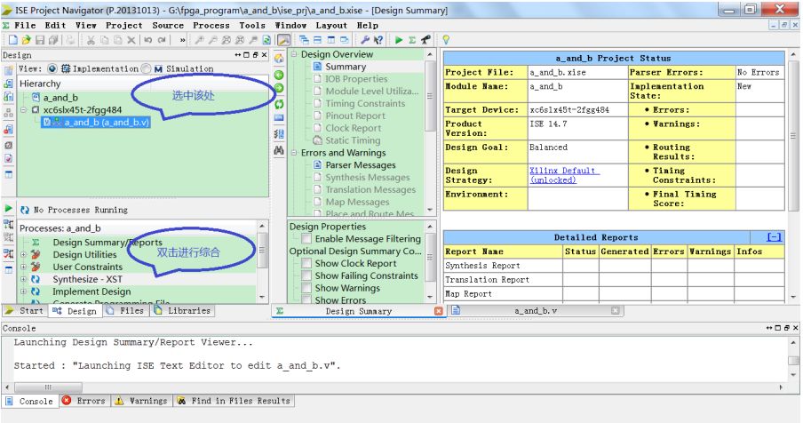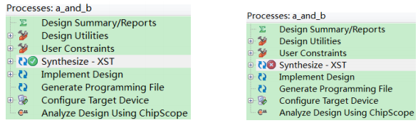 选中 a_and_b,双击 Synthesize 选项进行对我们的程序进行综合。若是没有语法错误则会出现图6左所示的界面,如果有语法错误则会出现图6右所示的界面,则需要查看错误报告将错误的地方改正并重新综合,直至编译通过为止。
