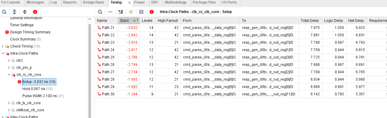 首先来看带有使能的数据,在本工程中的Tming Report中,也提示了同一个时钟域之间的几个路径建立时间不满足要求