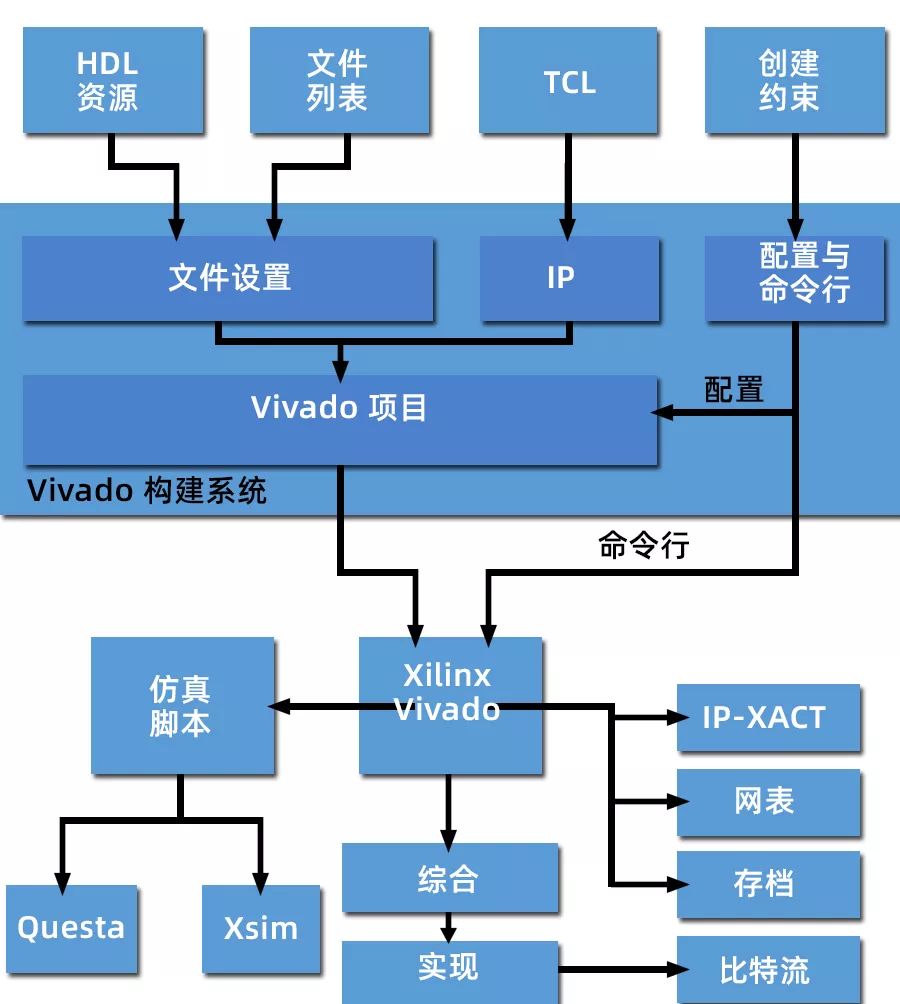 然而,上述机制需要一定数量的手动操作,而且在 Vivado 设计套件项目外对设计的参数进行设置,也存在不够灵活的问题。因此,为了简化上述操作,我们已经开发出对应脚本。其思路是在提供项目的 HDL 和 TCL 源文件的同时,提供从头创建 Vivado 设计套件项目所需的其他配置文件。设计构建脚本的目的是帮助用户在单独的 Vivado 设计套件项目下开发独立的项目组成部分(特色),且能够以其他配置方式对项目不同组成部分的源文件进行组合。此外,构建脚本也可用于创建目标构建工件,例如 IP XACTIPXACT 封装、仿真、综合、实现和比特流生成。