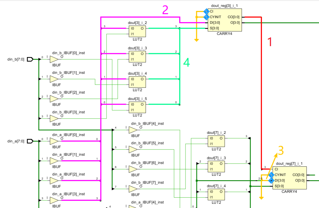 :综合后的schematic后可以发现,在dout2的输出中,每4个CARRY4后都会有一级的触发,这样时序就会好很多,但造成的代价是LUT会增加。