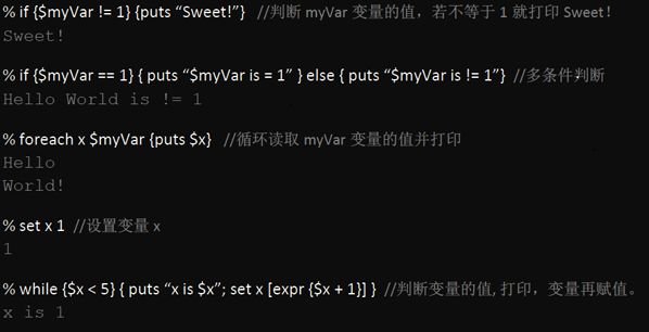 Tcl语言中用于控制流程和循环的命令与C语言及其它高级语言中相似,包括if、while、for和foreach等等。