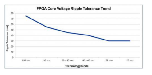 除了要求日益增多的电源轨外,当前FPGA的工作电压也要比以前的FPGA低,因为这有助于降低功耗,提高集成度,但也增加了复杂性,因为电源必须能够保持越来越严格的电压容差要求(见图1)。举个例子,自从用130nm工艺生产FPGA以来,基于28nm技术节点的FPGA的内核电压纹波容差的公开幅度已经降低了一半还多。误差预算百分比已经从5%下降到3%,并正在向2%迈进。保持电压容差要求与理解并满足FPGA电流要求有关。