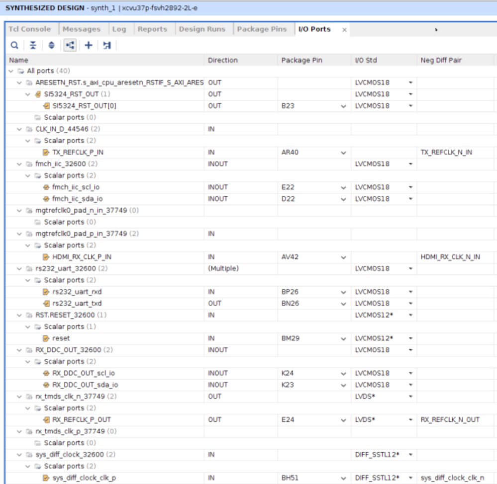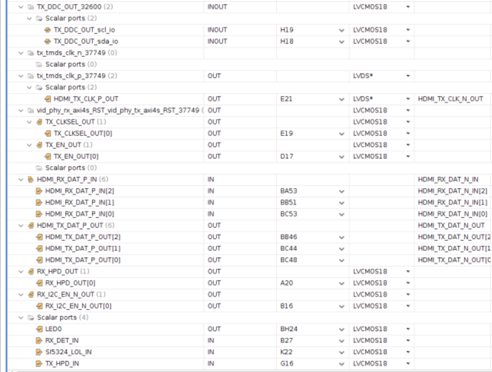 在此视图中,选择 I/O 端口,然后使用新管脚对其进行更新。(GT TX/RX 引脚将已填充完成)