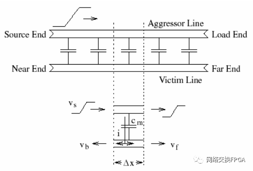 当干扰传输线上升沿信号Vs通过时,会在受干扰线上产生一个前向的耦合电压Vf和后向的耦合电压Vb,其中前向电压产生的脉冲传向受干扰线的远端,后向电压产生的脉冲传向受干扰线的近端。