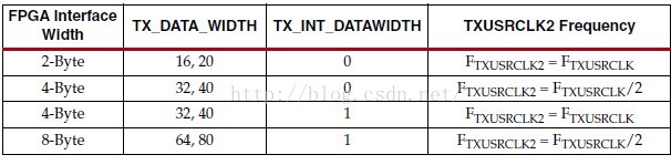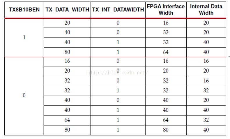 发送数据接口是TXDATA,采样时钟是TXUSRCLK2,在TXUSRCLK2的上升沿对TXDATA进行采样。TXUSRCLK2的速率由线速率、TX Interface接口位宽和8B/10B是否使能决定(TXUSRCLK2频率= 线速率/ TX_DATA_WIDTH ;比如线速率是10Gb/s,TX_DATA_WHDTH等于80,那么TXUSRCLK2的频率是125MHz)。TXDATA的位宽可以配置成16/20/32/40/64/80位宽,通过TX_DATA_WIDTH 、TX_INT_DATAWIDTH、TX8B10BEN三个属性设置可以配置成不同的位宽,具体属性如表2所示。